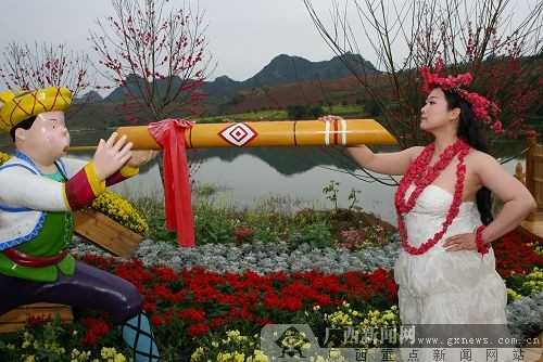 前來(lái)參加2009花花大世界舉辦的山水桃花節(jié)之“芙蓉舞桃花、山水也動(dòng)容”的網(wǎng)絡(luò)紅人芙蓉姐姐身著白紗公主裙,在桃花叢中擺出經(jīng)典的S造型,并許下桃花愿,要尋找一位“壯壯的,心地善良的阿牛哥”陪伴其終身。