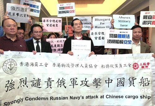 二月二十四日,香港船員及船務運輸業(yè)界代表前往俄羅斯駐香港領事館進行抗議,要求俄羅斯當局嚴懲肇事者,并對死傷者負責。二月十五日,由香港船公司租憑的貨輪“新星號”遭俄羅斯海軍炮擊而沉沒,造成八名船員失蹤及死亡。中新社發(fā) 張勤 攝