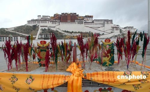 藏歷新年期間,風(fēng)景秀麗的布達(dá)拉宮廣場(chǎng)上供奉了幾只大型的“切瑪”,象征著五谷豐登、風(fēng)調(diào)雨順和吉祥如意的美好愿景。供奉“切瑪”是藏族民眾的新年傳統(tǒng)習(xí)俗,切瑪盒內(nèi)一頭裝有拌好的酥油糌粑,另一頭裝滿小麥,壘成金字塔型,中間插上一朵花或酥油制的“字珠”。中新社發(fā) 周波 攝