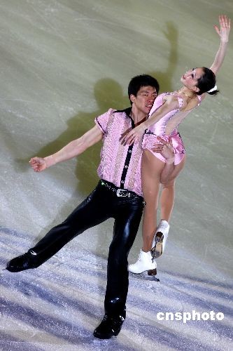 中國(guó)著名花滑組合、本屆大冬會(huì)雙人滑冠軍張丹張昊在表演中。中新社發(fā) 富田 攝