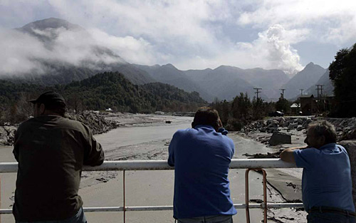 2月26日,在智利首都圣地亞哥以南1200多公里的柴滕市,當?shù)鼐用裼^看噴發(fā)煙霧的柴滕火山。佩德羅·門多薩 攝