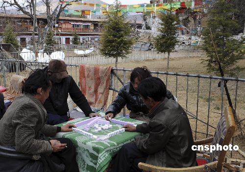 2月28日,拉薩市東城策門(mén)林藏民聚居區(qū),社區(qū)居民搭起桌子在室外打麻將休閑。中新社發(fā) 廖攀 攝