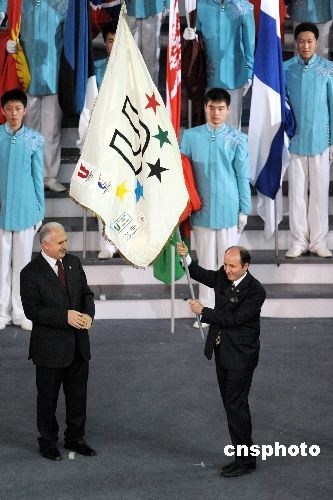 國(guó)際大體聯(lián)會(huì)旗被轉(zhuǎn)交到下屆大冬會(huì)主辦城市——土耳其埃爾祖魯姆市代表手中。中新社發(fā) 姚庭山 攝