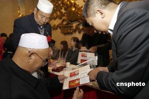 全國(guó)“兩會(huì)”即將開(kāi)幕,代表、委員們3月1日陸續(xù)抵京報(bào)到。圖為甘肅省政協(xié)副主席、天水市伊斯蘭教協(xié)會(huì)會(huì)長(zhǎng)馬國(guó)瑜(左)在北京駐地領(lǐng)取證件。中新社發(fā) 盛佳鵬 攝