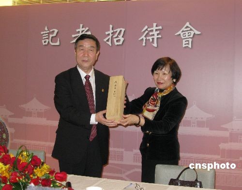 3月2日下午,臺北故宮博物院與北京故宮博物院代表在臺北故宮博物院,就2月15日雙方在北京達成的共識舉行進一步會談,并在會后召開記者會,發(fā)表落實合作交流方案,雙方同意在不涉及名稱載示及法令之前提下,進行8項實質(zhì)性合作。根據(jù)落實方案,今年故宮兩院將舉辦首屆學(xué)術(shù)研討會并每年于7月至9月互訪、互贈新出版品,互派人員駐訪2至3個月,協(xié)商互設(shè)商品柜臺,臺北故宮今年舉辦的雍正特展向北京故宮借展27組(37件)文物等。圖為臺北故宮博物院院長周功鑫(右)向北京故宮博物院院長鄭欣淼(左)贈送唐代懷素《自敘帖》的高仿真復(fù)制品。中新社發(fā) 路梅 攝