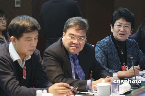 3月4日,全國政協(xié)十一屆二次會議進(jìn)行分組討論,審議政協(xié)全國委員會常務(wù)委員會工作報(bào)告和提案工作情況報(bào)告。圖為全國政協(xié)委員遲寶榮(右一)在分組討論上為百萬“鄉(xiāng)村醫(yī)生”找出路。中新社發(fā) 盛佳鵬 攝