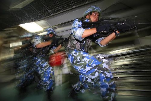 3月4日,中國海軍特戰(zhàn)隊員在“廣州”號導(dǎo)彈驅(qū)逐艦上進行參演前的反恐演練。當日,隨海軍“廣州”號導(dǎo)彈驅(qū)逐艦赴巴基斯坦參加“和平-09”海上多國聯(lián)合軍演的海軍特戰(zhàn)隊員在“廣州”艦上進行最后一次軍事演練。中國海軍特種作戰(zhàn)部隊將首次在多國特戰(zhàn)部隊聯(lián)合演習(xí)的國際軍事舞臺上亮相。查春明 攝