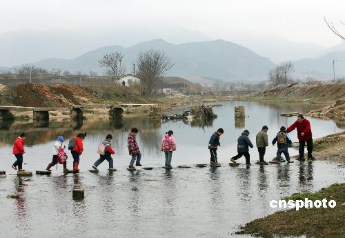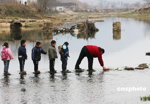 3月3日,在斷橋下游約100米處,蔡店中心小學學前班班主任郭炳香在河中為孩子們鋪過河石。武漢市黃陂區(qū)蔡店鄉(xiāng)姚蔡河上一座連通兩岸的小橋于2008年7月2日被洪水沖垮,此后一直無人修復,附近300多名孩子只好趟河去上學。