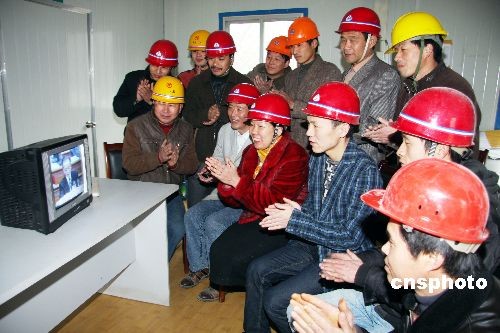 3月5日,煙臺(tái)農(nóng)民工圍在一臺(tái)電視機(jī)前收看溫總理的政府工作報(bào)告。當(dāng)日,煙臺(tái)市山海云天建筑工地上的農(nóng)民工心系全國兩會(huì),在工地負(fù)責(zé)人的安排下,他們坐在電視機(jī)前,收看中央電視臺(tái)現(xiàn)場直播的溫家寶總理在全國人大第十一屆二次會(huì)議上做的政府工作報(bào)告。中新社發(fā) 武前才 攝