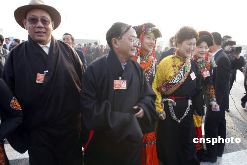 3月5日上午,十一屆全國人大二次會(huì)議在北京人民大會(huì)堂開幕。來自四川的全國人大代表甲登·洛絨向巴、李昌平等一同步入會(huì)場。中新社發(fā) 盛佳鵬 攝