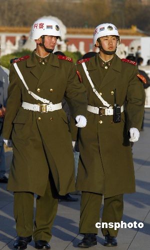 3月5日,中國(guó)軍隊(duì)糾察士兵在北京天安門(mén)廣場(chǎng)檢查軍容軍紀(jì)。中新社發(fā) 鄭雄增 攝