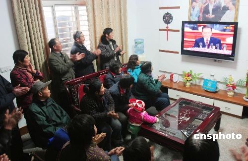 3月5日,江蘇省海安縣海安鎮(zhèn)園莊村的村民們聚集在一起收看“兩會”現(xiàn)場直播。當(dāng)日,十一屆全國人大二次會議在北京人民大會堂召開,村民們覺得溫家寶總理在大會上所作的政府工作報告中提出的一系列惠農(nóng)政策深得人心。中新社發(fā) 周皖芹 攝