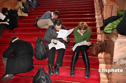 2009年3月5日上午,在北京人民大會(huì)堂內(nèi)的臺階上,各國記者忙著發(fā)稿。今年兩會(huì),3000多名中外記者云集北京,外國記者就達(dá)到800多名。今年兩會(huì)是平年例會(huì),但報(bào)名參加的外國記者與去年換屆之年不相上下。西方主流媒體派出記者人數(shù)增多,如路透社、法新社、彭博社等派出記者人數(shù)都超出了去年的規(guī)模。中新社發(fā) 王保勝 攝