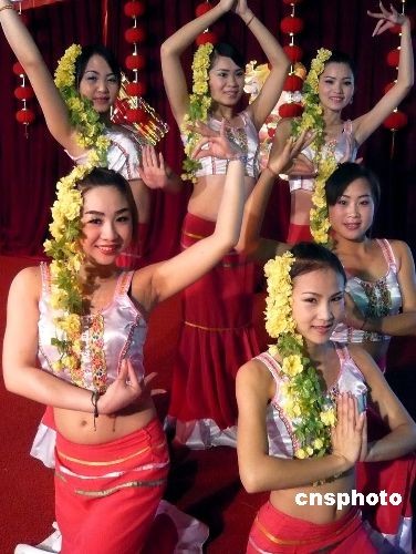 3月7日,為慶!叭.八”國際婦女節(jié)的到來,北京植物園舉行賞花送花活動。特設的“女人花”展區(qū)內(nèi)展示的花卉名稱中均帶有“女”字:如“小葉女貞”、“舞女蘭”、“美女櫻”等。每位在熱帶展覽溫室參觀的女士,可以得到一束美麗的康乃馨。圖為云南傣族姑娘頭戴鮮花為參加活動的游客表演舞蹈。中新社發(fā) 錢興強 攝
