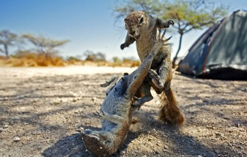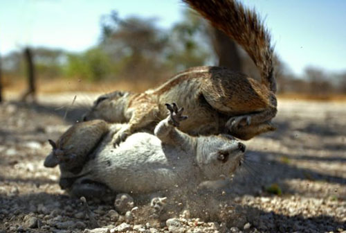 松鼠“耍功夫”。一名叫大衛(wèi)·斯萊特的英國攝影師在納米比亞的埃托沙國家公園拍到了幾只南非地松鼠搏斗的場景。照片拍攝于納米比亞的埃托沙國家公園,一只南非地松鼠正在“教訓”一位“入侵者”。對手倒在地上,這只地松鼠毫不猶豫地用它毛茸茸的腿一陣狂踢,以保護自己領地不受侵犯。