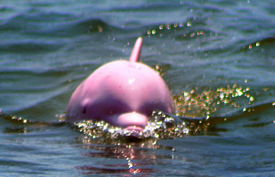 粉紅色海豚在水中嬉戲。拍攝地點(diǎn)是在美國(guó)路易斯安那州的加爾卡修湖,拍攝者是當(dāng)?shù)氐囊幻L(zhǎng),他說這只粉紅色的小寬吻海豚甚至還擁有淡紅色的眼睛。這只海豚也可能是世界上唯一一只粉紅色的寬吻海豚。