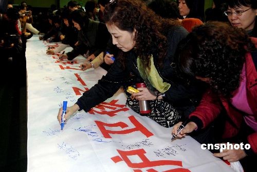 三月八日國際婦女節(jié),由廣東省婦聯(lián)主辦的“凈化網(wǎng)絡(luò)護(hù)衛(wèi)孩子--萬名母親網(wǎng)絡(luò)護(hù)衛(wèi)行動(dòng)”啟動(dòng)儀式,在廣州華南師范大學(xué)附屬中學(xué)舉行。圖為母親和孩子紛紛簽名支持該項(xiàng)活動(dòng)。中新社發(fā) 劉衛(wèi)勇 攝