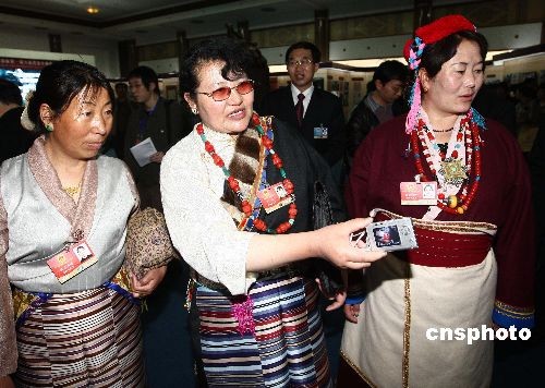 3月8日,參加全國人大會議的西藏團(tuán)藏族女代表參觀在北京民族宮舉辦的西藏民主改革50年大型展覽。中新社發(fā) 杜洋 攝