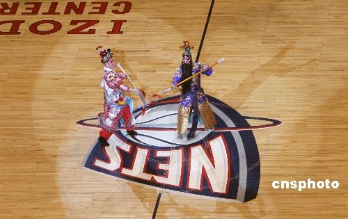 當(dāng)?shù)貢r間3月8日晚,美國大紐約地區(qū)“2009中華之夜”晚會在NBA新澤西網(wǎng)隊主場舉行,NBA賽場吹出一陣“中國風(fēng)”。在新澤西籃網(wǎng)對陣紐約尼克斯的賽間休息時,傳統(tǒng)京劇表演令許多美國球迷倍感新奇。中新社發(fā) 魏晞 攝