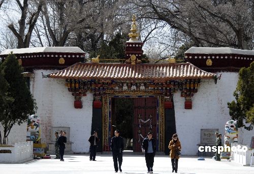 3月9日,西藏拉薩,游人在著名的羅布林卡園林中享受春光。中新社發(fā) 廖攀 攝