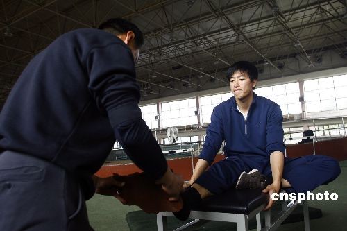 3月10日上午, 劉翔在上海莘莊基地開始進行正式訓練,在訓練間隙,孫海平教練用一塊海綿來幫助訓練劉翔右腳的靈敏性。孫海平教練表示:由于劉翔的傷勢剛剛恢復(fù),右腳踝關(guān)節(jié)力量還不夠,用海綿訓練是為了增加劉翔右腳踝的靈活性!敝行律绨l(fā) 湯彥俊 攝