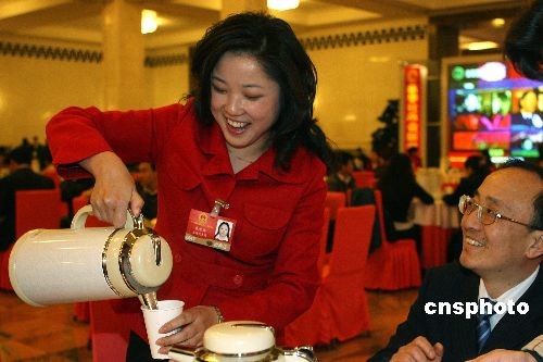 3月10日下午,十一屆全國人大二次會(huì)議在北京人民大會(huì)堂舉行第三次全體大會(huì),聽取最高人民法院和最高人民檢察院的工作報(bào)告。會(huì)前,上海代表團(tuán)的打工妹代表朱雪芹臨時(shí)“改行”,熱情地為其他代表沏茶倒水。中新社發(fā) 任晨鳴 攝