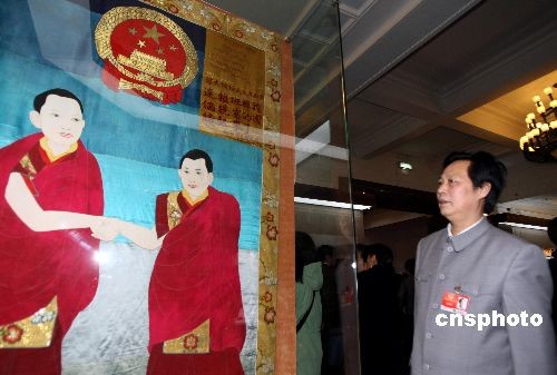 全國(guó)政協(xié)文藝界委員、扮演“毛澤東”的演員汪國(guó)新,3月11日參觀在北京民族宮舉辦的西藏民主改革50年大型展覽。中新社發(fā) 傅丹丹 攝