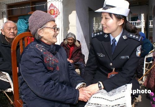 為傳達(dá)貫徹全國(guó)“兩會(huì)”精神,3月10日,河南商丘公安局交警支隊(duì)一大隊(duì)的警花們帶著宣傳資料來(lái)到轄區(qū)第一老年公寓,以多種形式向老人宣傳全國(guó)“兩會(huì)”精神。圖為警花和老人在聊天。中新社發(fā) 白項(xiàng)林 攝