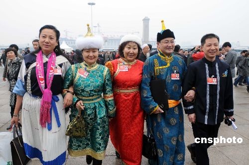 2009年3月12日上午,中國人民政治協(xié)商會議第十一屆全國委員會第二次會議圓滿完成各項(xiàng)議程后在人民大會堂閉幕。圖為在人民大會堂前的少數(shù)民族代表。中新社發(fā) 宋健浩 攝
