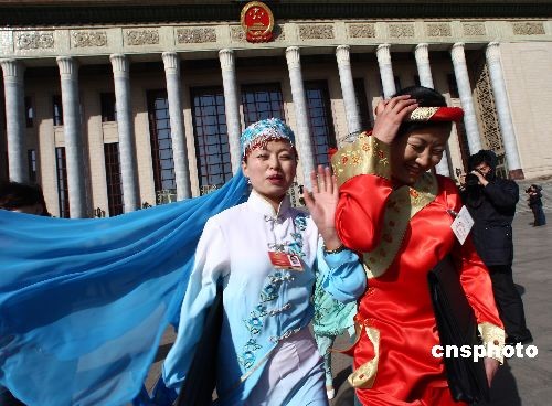 3月13日,第十一屆全國人民代表大會第二次會議在人民大會堂閉幕,少數民族代表在盎然的春風中步出人民大會堂。中新社發(fā) 杜洋 攝