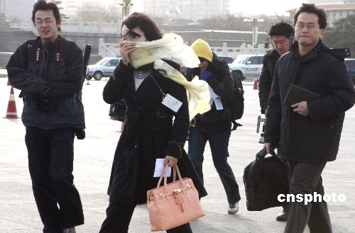 3月13日,初春的北京刮起凜冽的寒風(fēng),采訪第十一屆全國人民代表大會第二次會議閉幕會的記者們冒著狂風(fēng)艱難地穿過天安門廣場,進入人民大會堂采訪。中新社發(fā) 任晨鳴 攝