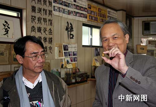 3月14日,由臺北縣政府文化局委托的專家組在“臺北縣博物館家族”之一的陳逢顯毫芒雕刻博物館內(nèi)調(diào)研。圖為臺灣著名微雕家陳逢顯(右一)向?qū)<医M成員展示他以臺北故宮博物院所藏“多寶閣”果核微雕作品為范本,正在以橄欖核進行雕刻的作品。 作者:陳立宇