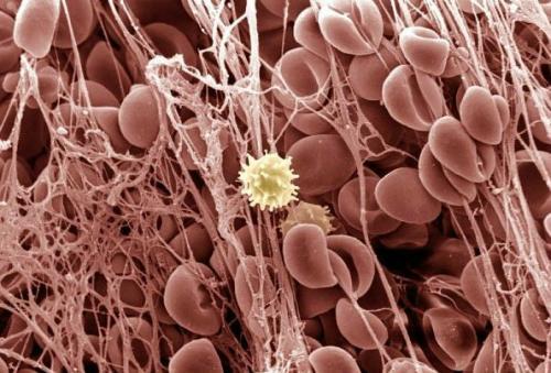 血液凝塊:這張圖看起來像是紅血球粘在了粘性網(wǎng)上,形成血液凝塊。位于中間的那個細胞是白血球。