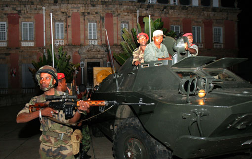 16日晚約7時,武裝部隊向位于市中心一座山上的總統(tǒng)府發(fā)起攻擊,首先發(fā)射了兩枚火箭彈,并鳴槍警告總統(tǒng)府守衛(wèi)部隊,隨后用擴音器朝守衛(wèi)部隊喊話。