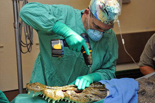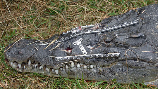 據(jù)英國媒體3月18日報道,美國佛羅里達動物園一只受傷的大鱷魚,經過手術,頭部被41枚釘子以及4塊鐵板固定,現(xiàn)在被人戲稱為“機器鱷魚”。這只長達10英尺的鱷魚是在一起車禍事故中受傷的。經醫(yī)生介紹,現(xiàn)在鱷魚的恢復情況良好。