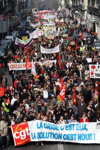 3月19日法國(guó)各大工會(huì)在全國(guó)各地聯(lián)合組織罷工和示威游行等活動(dòng),抗議政府在應(yīng)對(duì)當(dāng)前經(jīng)濟(jì)危機(jī)過程中忽視勞動(dòng)者權(quán)益和社會(huì)福利。