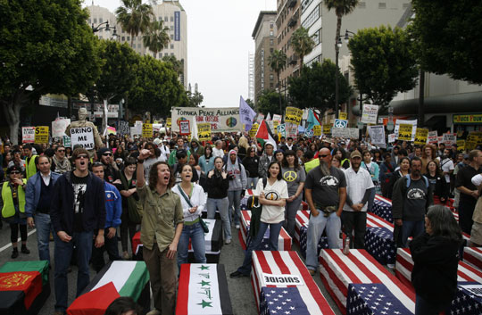 當地時間21日,美國數千名反戰(zhàn)人士聚集在洛杉磯,舉行反戰(zhàn)游行示威活動,紀念伊拉克戰(zhàn)爭爆發(fā)六周年,要求美國政府立即從伊拉克和阿富汗撤軍。