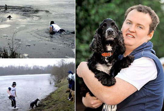 狗主人破冰救寵。據(jù)英國媒體報(bào)道,有時(shí)人類最好的朋友也需要朋友。因此,當(dāng)馬克(Marc Greenhalgh)的可卡犬賈維斯(Jarvis)被困在結(jié)冰的湖中時(shí),他義無反顧的跳進(jìn)去拯救它。