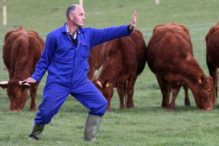 農(nóng)夫對奶牛打太極!皩ε椙佟钡某烧Z大家都明白并不是一個褒義詞,但英國一個奶牛場的農(nóng)夫Rob Taverner 卻不這么認為,每天早上都會身穿那套藍色工作服和一雙防水長靴,在他喂養(yǎng)的奶牛們面前表演太極拳。他認為動物非常容易受到人類情感感染,太極可以讓人將一切問題拋在腦后,進入一個較好的狀態(tài),他認為他的表演也會讓這些奶牛感到快樂,從而產(chǎn)出更多的牛奶。好像事實也證明Rob Taverner所言非虛。