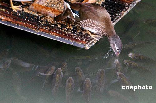 3月23日,蘇州拙政園池塘內(nèi)的鴛鴦給水中魚兒“喂”食。自08年秋季蘇州拙政園飼養(yǎng)在“卅六鴛鴦館”景點池塘內(nèi)上演了“鴛鴦喂魚”后,曾一度被人們傳為自然界動物親情的美談與佳話。時下,隨著今年春來水暖,該池塘里的鴛鴦們又開始充當(dāng)“愛心魚媽媽”,并爭相給成群結(jié)隊浮出水面的小魚兒“施舍”喂食,吸引了不少游客駐足觀看。中新社發(fā) 王建中 攝