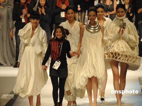 3月24日,中國國際時裝周(09/10秋冬季系列)在北京隆重開幕。來自18個國家的31位青年設(shè)計師在“漢帛獎”上的角逐,最終廣東青年設(shè)計師陳嘉慰的作品“點-線-面”獲得金獎。今年第17屆的“漢帛獎”大賽主題為“國慶招待會”。中新社發(fā) 樊建恩 攝