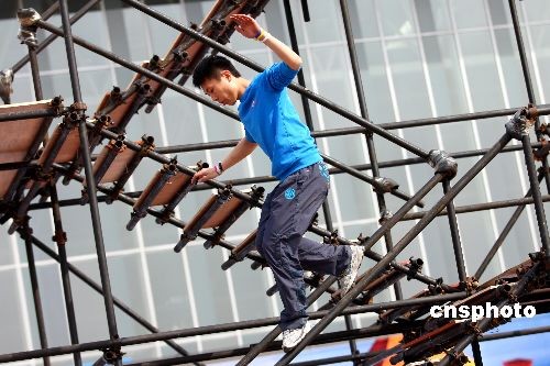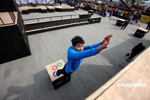 3月26日,世紀(jì)天樂(lè)杯——中國(guó)首屆跑酷運(yùn)動(dòng)國(guó)際公開(kāi)賽在北京盛裝亮相。跑酷運(yùn)動(dòng)誕生于上世紀(jì)80年代的法國(guó),意為把整個(gè)城市當(dāng)作一個(gè)大訓(xùn)練場(chǎng),一切圍墻、屋頂都成為可以攀爬、穿越的對(duì)象,最初曾是法國(guó)部隊(duì)訓(xùn)練士兵的方法,目前是都市青年中流行的時(shí)尚運(yùn)動(dòng)。本次賽事為期四天,共有來(lái)自六個(gè)城市的跑酷隊(duì)參賽,比賽分團(tuán)體和個(gè)人計(jì)時(shí)賽。在當(dāng)天進(jìn)行的團(tuán)體比賽中,來(lái)自北京的“城市猴子”隊(duì)摘得桂冠。 中新社發(fā) 富田 攝