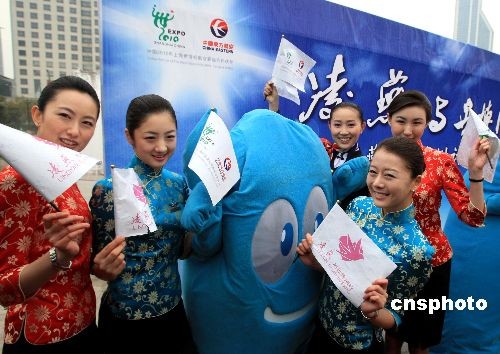 2009年3月27日,上海世博會倒計(jì)時400天,東方航空公司的中、日、韓籍空姐及“凌燕世博乘務(wù)組”,冒雨在上海人民廣場參與上海世博推廣公益活動。中新社發(fā) 潘索菲