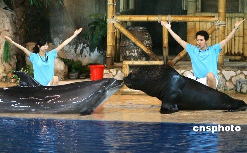 3月27日,北京海洋館十周年館慶紀(jì)念日,眾多海洋家族明星紛紛登場(chǎng)獻(xiàn)藝,剛剛升級(jí)為父親的海豚爸爸與海獅表演全國(guó)首創(chuàng)的“獅豚親吻”節(jié)目,贏得滿堂彩。中新社發(fā) 徐曦弋 攝
