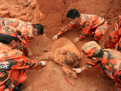 鄒森的這張照片,反映了地震對人類摧殘,同時也反映了生死瞬間母親的偉大。這張照片感動著世界。照片中的這位母親叫文學金,和女兒在“8.30”地震中遇難。