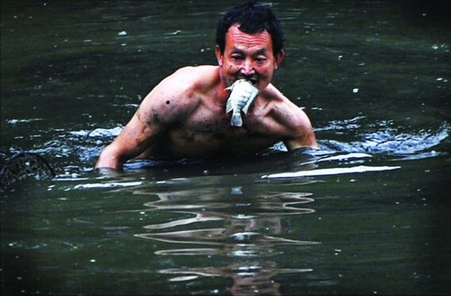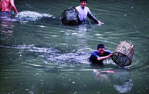 渾濁的池塘水中,無數(shù)福壽魚浮出水面,嘴巴奮力地一張一合。十來個(gè)壯年男子站在水中,有人穿著一身衣服,有人僅著底褲;有人拿著塑料袋、竹筐上陣,有人干脆赤手空拳,瞪大眼睛,在渾水中摸魚。他們的目標(biāo)不是探手可及、幾兩重的福壽魚,而是眾多沉在水底、動輒幾斤甚至上十斤的大魚。水不深,但黑黑的淤泥幾乎沒過摸魚者的臀部,這令他們舉步維艱。(肖海坤)