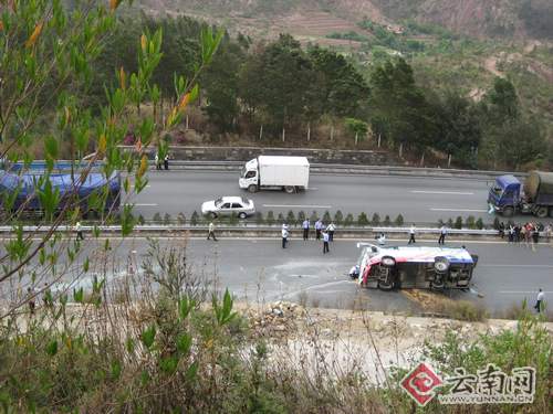 18日下午1點(diǎn)45分,安楚高速公路昆明至楚雄方向K128+500米處(孔家莊隧道出去1公里)發(fā)生一起重大交通事故,一輛從下關(guān)開往昆明載有29人的中型客車發(fā)生側(cè)翻,當(dāng)場死亡1人,28人受傷,其中重傷1人。事故發(fā)生后,交警部門對楚雄至昆明方向的高速路實(shí)施了封閉,記者去現(xiàn)場只能從320國道繞行至山上的小路,站在在距離事故現(xiàn)場約30米的山坡上,記者看到在開往昆明方向的高速路上,一輛客車側(cè)翻在路中間,雖是開往昆明方向,但車頭卻調(diào)轉(zhuǎn)了朝著相反方向。凹陷的車頭上,擋風(fēng)玻璃像蜘蛛網(wǎng)一樣滿是裂痕,右側(cè)有個(gè)很大的窟窿,車身旁邊一道長長的劃痕非常明顯,車身下漏了一大灘汽油,一塊標(biāo)有大理兩個(gè)字的白色牌子飛到了距離客車有5、60米的地方。這時(shí)交警部門正在做現(xiàn)場勘查,在汽油上散上了沙子。 “嘭”,我當(dāng)時(shí)聽到一聲巨響,跑出來一看,就看見一輛客車翻在坡底的高速路上,有個(gè)人被甩出了車外躺在地上一動(dòng)不動(dòng),其他的乘客在車上哭的哭,喊的喊!备咚俾放缘某鄞笸叻看宓囊晃淮迕衲慷昧塑嚨湑r(shí)的情景。附近一位路過的駕駛員猜測說,從擋墻在撞擊的痕跡上看,客車可能是撞上可擋墻后,又反彈回來,駕駛員急忙打方向盤,車子就來了個(gè)360度大轉(zhuǎn)身后翻倒在地!斑@段路過了隧道后,因?yàn)槭窍缕侣范,不少大車司機(jī)踩剎車時(shí)會(huì)不停地淋水,所以路面比較滑,司機(jī)車速稍一快就容易出事!