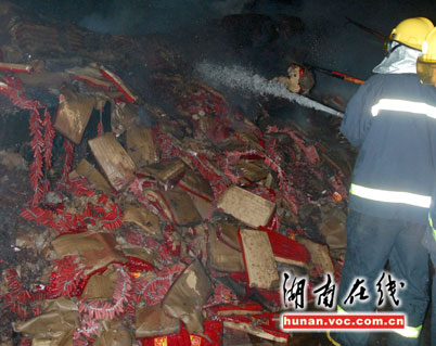 起火車輛是一輛半掛貨車,車上裝載物品正在燃燒并已經(jīng)發(fā)生爆炸,濃煙沖天,燃燒物四散飛濺。在場(chǎng)民警立刻設(shè)置警戒線,疏散圍觀群眾。距離現(xiàn)場(chǎng)一公里左右就可以看到事故地點(diǎn)濃煙滾滾,火光沖天,周圍500米內(nèi)到處是燃燒爆炸后的鞭炮殼。路上汽車已經(jīng)排成長(zhǎng)龍,雙向車道全部封閉確保過往車輛及司乘人員的安全。株洲消防、路政部門積極救援,現(xiàn)場(chǎng)消防部門四輛消防車同時(shí)作業(yè),前2輛消防車停在距起火車輛近20米處實(shí)施滅火,第三輛車鋪設(shè)二條水帶干線出二支水槍滅火,第四輛車負(fù)責(zé)供水,阻止鞭炮繼續(xù)燃燒爆炸。