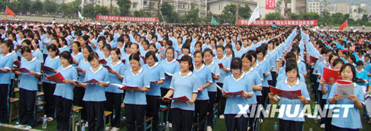 6月25日,在四川鄰水縣鄰水實(shí)驗(yàn)中學(xué)體育場(chǎng),來(lái)自眾多學(xué)校的上萬(wàn)名師生齊聲誦讀國(guó)學(xué)經(jīng)典。