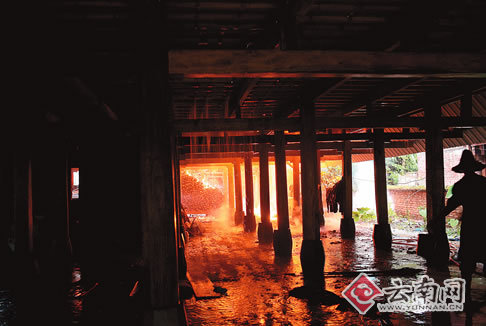 與此同時,發(fā)現(xiàn)房屋起火的村民也跑到村寨辦公室,用高音喇叭通知村民趕來救火。等玉溫接到兒媳電話趕回來時,大火已經(jīng)燒得通紅,現(xiàn)場趕來的數(shù)十名村民已經(jīng)開始用臉盆和水桶接水救火了。隨后趕來的公安民警、以及從遠處的曼春滿、曼聽等村寨趕來的村民也紛紛加入到了救火隊伍中。